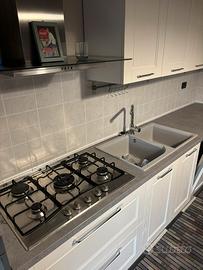 Vendo cucina attrezzata Veneta Cucine lungha 3,5 mt con elettrodomestici, forno ventilato, lavastoviglie e piano cottura a 5 fuochi HotPoint. Escluso frigorifero. Lavandino doppio in iresina e doccetta. Ventilaziole Elica con vetro piatto e acciaio