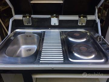 Vendo cucina portatile stile flight case, utilizzabile anche in casa, per l'utilizzo in campeggio è possibile collegare le piastre di cottura con una batteria da auto, non inclusa, inoltre è presente un serbatoio per l'acqua, ma è possibile collegarla ad impianti domestici.