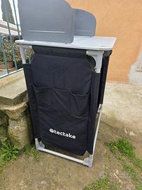 Cucina da campeggio Tectake, ideale per fornelli a gas completa di paravento, dotata di uno scomparto chiudibile con ripiani interni, ha una tasca esterna per attrezzi da cucina. Dimensioni 76 x 53 x 107 cm , 7 kg; in alluminio e tela, dotata di borsa da trasporto