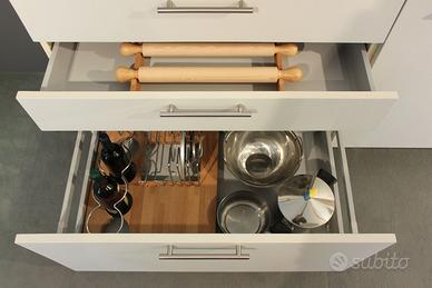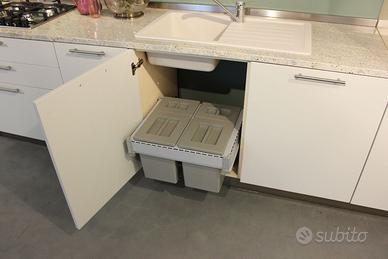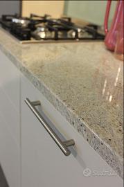 Cucina con ante in legno laccato a poro aperto grigio chiaro e grigio scuro, piano in granito. Il costo si intende dei mobili, piano, zoccolo. dimensioni foto 375x64x240h. Elettrodomestici, trasporto e montaggio sono esclusi dal prezzo ma concordabili. Prodotto visionabile in negozio telefonando per appuntamento.