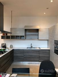 CUCINA CON GOLA : ANTA NOBILITATO TERMOSTRUTTURATO SP 22 MM FINITURA CEMENTO E EUCALIPTO GRIGIO. LATO COLONNE L 285 H 216, ZONA LAVAGGIO L 214, PENISOLA CON COTTURA L 276 P 98. COMPLETA DI ELETTRODOMESTICI DA FOTO ( FRIGO E LAVASTOVIGLIE NON INCLUSI )