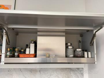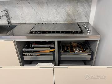 Vendo Cucina design MINOTTI con piano in acciaio monoblocco FRANKE completa di elettrodomestici, forno, piano cottura, cappa integrata, lavastoviglie. Moduli da cm.60 in linea cm.3000. Pensili da 120 in vetro temprato laccato con apertura vasistas. Buono stato nonostante l’età. Anta presente nellultima foto evidenzia il distacco del rivestimento dato dall’età. Smontaggio e trasporto a cura dell'acquirente.