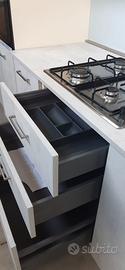 Ante bordate ABS da 1 mm, senza spigoli vivi e con schiene rinforzate da 6 mm. Cerniere rallentate della ditta Blum. Cassetti e cestoni con sponde in metallo e fondo da 1.2 cm ammortizzati.
