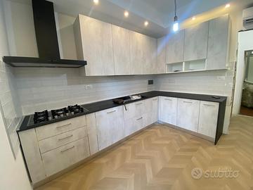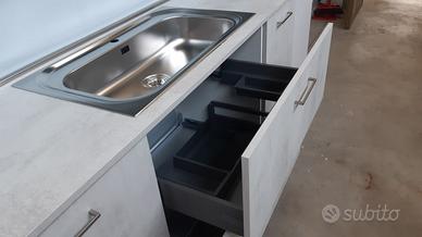 Cucina fine serie , Con frontale in laminato cemento bianco con sfumature grigio chiaro, adattabile alle vostre misure grazie ad un top NUOVO in laminato ancora da tagliare e modificare secondo le vostre msisure. La cucina misura 4.5 mt, ditta Ar2 .