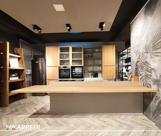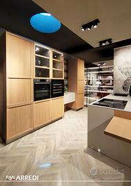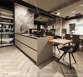 Cucina di mostra modello Newport anta in legno combinata al modello Infinity anta pet cachemire opaco, Top Neolith Pietra di luna silk, lavello sottotop, dispenser sapone e miscelatore, comboline con porta calici.
