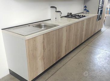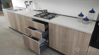 Cucina NUOVA di fine serie di ml 4.50 ed è possibile modificare la posizione degli elementi grazie ad un piano di lavoro in laminato NUOVO da tagliare e modificare (possibile sceglierlo tra più colorazioni) Basi e colonne in laminato effetto rovere nodato chiaro, pensili h 96 cm laminato effetto cemento grigio chiaro. Ante bordate ABS da 1 mm, cassetti e cestoni ammortizzati grazie a cerniere rallentate della Blum. Cassetti con sponde in metallo e fondo da 1 cm grigio antracite. Elettrodomestici COMPRESI nel prezzo come da foto: -Frigo 320 lt lordi con freezer a 3 cassetti sotto (è possibile togliere il frigo e creare colonna dispensa, senza costi aggiunti) -Piano cottura inox 4 fuochi -Lavello 2 vasche inox -Cappa a scomparsa -Forno ventilato multifunzione Predisposizione per lavastoviglie e microonde, non inclusi nel prezzo. Possibilità di trasporto e montaggio con prezzo a parte. Possibilità di finanziamento. Per maggiori info: