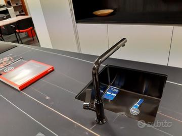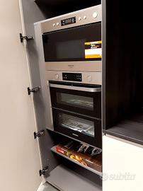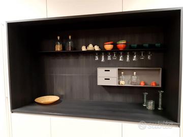 Cucina di esposizione composta da isola P cm 120 L cm 240 vetro Decor finitura Sahara su ante telaio alluminio nero, piano e fianconi sp 1,2 cm, completa di vasca lavello, miscelatore, piano cottura induzione e lavastoviglie. Parete abbinata L cm 362,4 h cm 263 P cm 70 laminato grigio chiaro, con nicchia completa di boiserie finitura laminato larice nero, completa di frigo L 70, forno e microonde a scomparsa. Trasporto e montaggio esclusi.