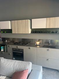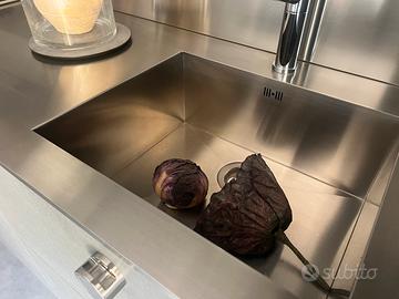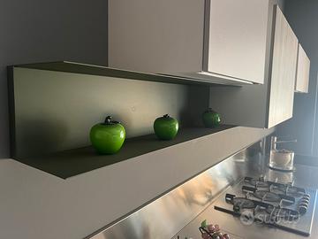 Eliminiamo cucina Doimo. Cucina luxury. Con top in acciaio continuo unico blocco con lavello integrato. Schienale in acciaio. Mensole in acciaio laccate verdi muschio.