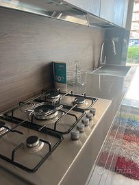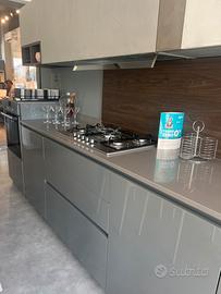 In quarzo Silestone. Alzatina in quarzo. Schienale in melaminico nice scuro. Compresa di forno, piano cottura, lavastoviglie, lavello semi filo e miscelatore. Tutti i pensili hanno luce integrata nel fondo.
