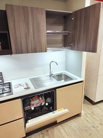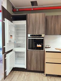 Cucina nuova di esposizione: composizione di dimensioni L 398 - H 216 - P 60/70. Ante laccato opaco, colonne e pensili effetto legno Olmo, piano e schienale in Quarzo. Gruppo elettrodomestici Whirlpool con frigo combinato da 60, forno ventilato multifunzione, piano cottura a 5 fuochi in acciaio, lavastoviglie, lavello Franke in acciaio 1 vasca+gocciolatoio con miscelatore coordinato, cappa Silverline estetica design. Illuminazione led sotto-pensile inclusa nell'offerta.