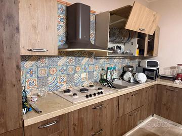 Una cucina completa con forno e frigo, un mobile da salone legno Modello Messicano, e mobiletto ingresso