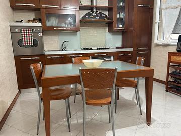 Cucina lineare completa , finitura in legno ciliegia/noce, con mainglie cromate. La cucina è in buone condizioni e include tavolo in legno caldo, con top in vetro e 4 sedie.