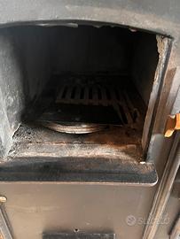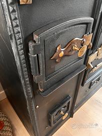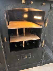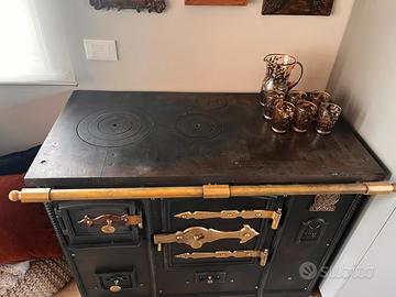 Stufa, o termocina cucina economica con due piani cottura e lastra in ghisa. Sportelli forno e scaldino, con cassettino per la cenere. Attualmente è stata modificata nella parte del forno con delle listelli in legno per utilizzarla come porta vino. Appoggiata su un Piano in abete per rifinirla . Ancora perfetta percessere usata come stufa, ma anche come complemento d’arredo