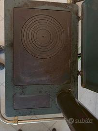 Cucina economica a legna con forno dimensioni esterne 85x55 h74 (96x61 con paracolpi dorato) ø canna fumaria 13cm. Coperchio leggermente curvo, ripiano con segni di corrosonie, ma senza crepe o danni.