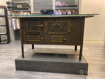 Stupenda stufa antica XIX secolo restaurata da ARREDAMENTO NON FUNZIONANTE... con piano in vetro temperato e pedana rialzata in legno spazzolato tinta grigio... ideale per bar... ristorante... negozio... da vedere...