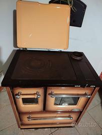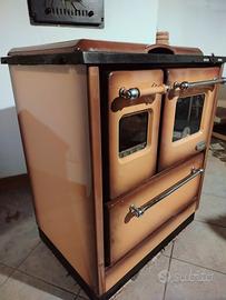 stufa a legna usata, con piano cottura e forno. marca Sideros. capacità di riscaldamento 170 m cubi. tiraggio necessario 0.15/0.20 MBar. dimensioni 55x74,5x87cm. manca la cornice esterna a cui solitamente si appendono gli utensili e i panni. possibilità di acquistare tubi da canna fumaria compatibili, con radiatore (50€).
