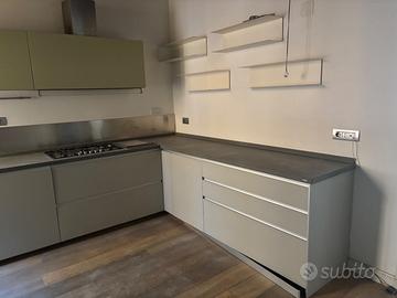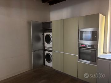 Cucina Ernestomeda in ottime condizioni, poco usata, di grandi dimensioni compresa di elettrodomestici (tutti AEG). Pagata 40.000 euro. Include: lavastoviglie, forno a microonde, forno elettrico, frigorifero, colonna e armadio lavanderia con lavatrice e asciugatrice. Tutti i cassettoni sono in legno massello laccato. La cappa con motore di aspirazione ha luci led incorporate. Ottimo stato. Si estende su 3 pareti con misure 430x 420x280