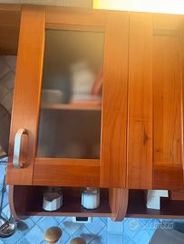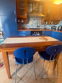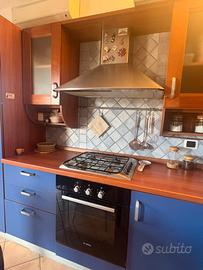 Cicina in ottimo stato materiale essenza di legno tinta noce e mdf blu con tavolo e 4 sedie Frigo incluso Esclusi forno e lavastovilgie Bosch vendo separatamente Forma a L misure : 224x302 cm