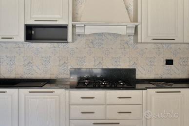 Caratteristiche tecniche della cucina modello Lola: Anta con telaio in legno di frassino massiccio sp.24 mm con unione a 45°. Dotate di sistemi di apertura BLUM serie Legrabox con portata fino a 70kg. Finitura décapé Ghiaccio. Il sistema di apertura utilizza le maniglie Art.531 in Nichel. I fusti sono in nobilitato con trattamento idrorepellente, mentre lo zoccolo, alto 15 cm, è realizzato in legno impiallacciato in finitura anta.