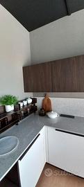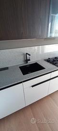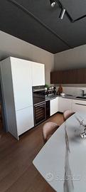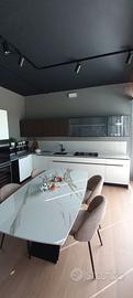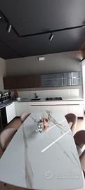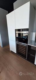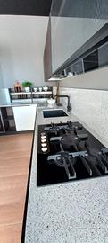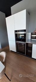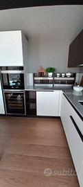 Misure L. 279 cm (lato colonne) L. 367 (lato cottura) .Piano e schienale in quarzo. Set elettrodomestici Hotpoiont comprendenti frigo combinato, forno, piano cottura gas, lavastoviglie, cappa scomparsa e cantina incasso.