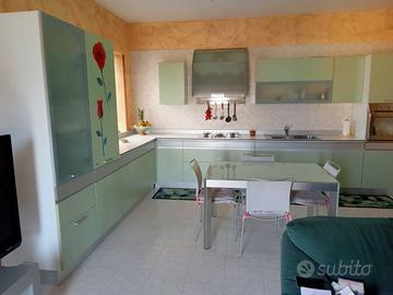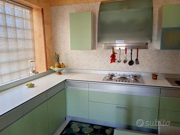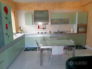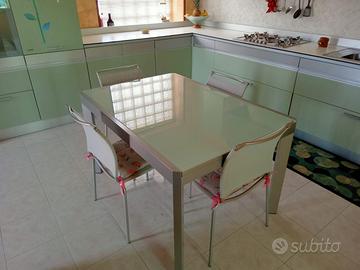 Cucina Febal come in foto misure 330×390×60 , tavolo in vetro allungabile 6 posti e sedie in alluminio, colore acquamarina, completa di elettrodomestici .