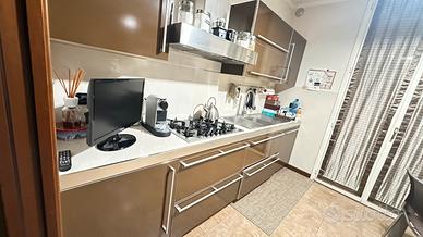 Cucina FEBAL laccata lucida color cioccolato comprensiva di frigorifero con congelatore, forno, piano cottura e cappa. Misura 3 metri lineari