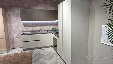 Cucina in offerta Febal Casa Modula Linea ad angolo con basi e colonne in melaminico effetto vesuvio sabbia, top e pensili in fenix effetto metallico, cappa Elica, kit elettrodomestici Hotpoint.