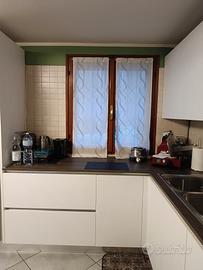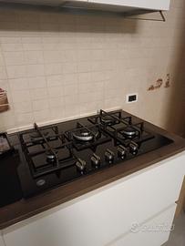 cucina ad angolo con fornello a 5 fuochi, doppio lavabo e forno a parte