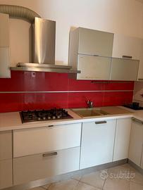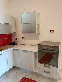 Cucina completa disposta su due lati. Completa di frigo e forbo di libera installazione, lavastoviglie e cappa ad aspirazuone forzata.