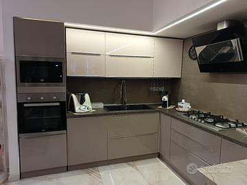 Vendo cucina Mobilturi, usata pochissimo, completa di cinque elettrodomestici, misura 210x270, colore tortora chiaro e tortora scuro.