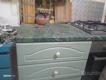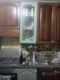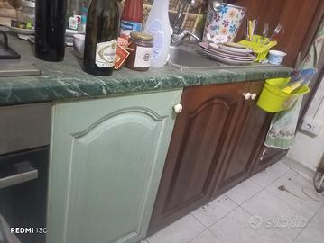 cucina con ante tytte in legno e vetrinetta. fornello cambiato l'anno scorso, forno due anni fa. tutto funzionante tranne il frigo a incasso che va gettato. presenta graffi laterali non sulle parti delle ante in legno.