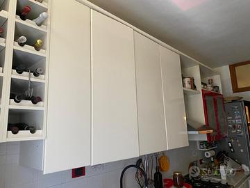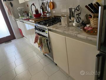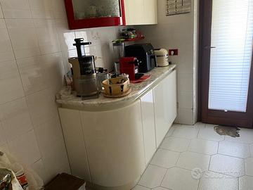 Come da titolo si vende cucina Gaggioli. Usata ma ancora in buono stato, bianca, con pensili bianchi e rossi (a vetrina) e top di marmo. La cucina è corredata di lavastoviglie Bosch da incasso e piano cottura a gas/forno Lofra. Insieme si cede anche tavolo (sempre con piano in marmo e nr. 4 sedie. Trasporto a carico dell’acquirente.