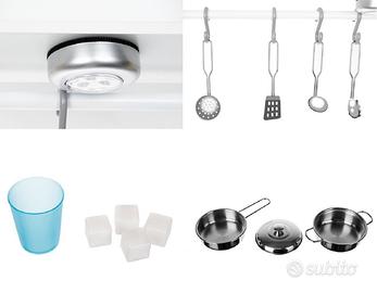 ACCESSORI INCLUSI: Fornello, Lampada, Pentola, Padella e coperchio, Mestolo, Cucchiaio per spaghetti, Cucchiai, Paletta per pasta, 4 ganci, Una tazza + 4 cubetti di ghiaccio, Lavello estraibile riempibile d'acqua.