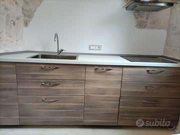 Si vende cucina IKEA metod - finitura Brokhult, composta da tre basi: due da cm 60 di larghezza, a cassetti, ed una base da cm. 80 di larghezza a due ante, tre pensili alti e profondi cm 40 di cui uno largo cm 80 e due cm 60, due top bianchi, uno da cm 220 l'altro da cm 200 con incassi lavello e piano cottura, lavello inox a due vasche, piano cottura acciaio inox a gas quattro fuochi, lavastoviglie Bosch da 60 cm a libera installazione, frigorifero a due porte Bosch bianco a libera installazione, una colonna forno, con forno da incasso, alta cm 245 profonda 62, altra colonna con cassetti alta cm 225 e profonda cm 45.