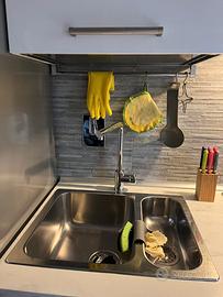 La cucina si compone di un piano con Forno Candy 65 L Multifunzione Ventilato Colore Acciaio Inox, piano cottura 4 fuochi Candy, cappa Ikea e Frigorifero ZeroWATT combinato Capacità netta 324 Lt - Classe energetica A++ NoFROST, lavandino Ikea con doppia vasca in acciaio.