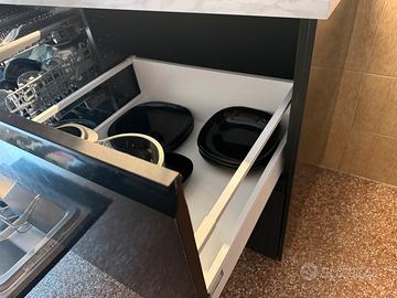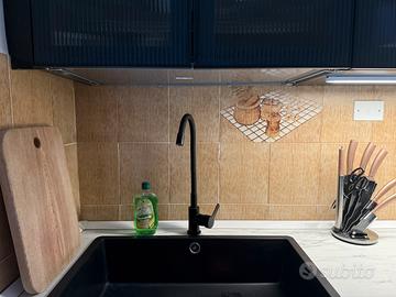 Cucina acquistata nel 2024 in vendita per trasloco. Le ante sono ancora fasciate nella pellicola, la cucina si compone in 2 blocchi ma può essere adattata secondo le esigenze. Colore ante nero opaco, top marmo bianco opaco. Per maggiori 📩