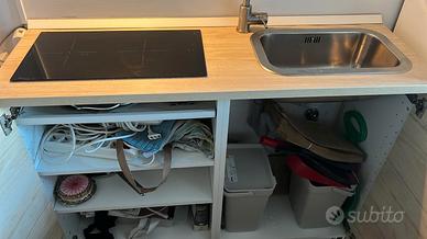 Piccola cucina composta da due mobiletti con lavello e miscelatore e fornello a induzione a due piastre. Sono inoltre compresi due pensili con scolapiatti e cappa.