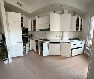 Sviluppo ad angolo per circa 6 metri lineari, con due colonne predisposte per frigo da incasso, forno e microonde (non inclusi).