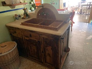 - Piano lavello completamente lavorato a mano in marmo pregiato cosi come il ripiano e riporti in maiolica sia nella parte anteriore che posteriore non essendo poggiato al muro, magnifico effetto;