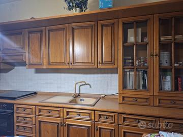 Cucina completa in legno di castagno fine anni 80 ad angolo 4,15 x 2,60 con frigo, forno, piano cottura, lavandino. Più un tavolo e sei sedie, un mobiletto abbinato a due ante.