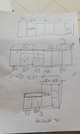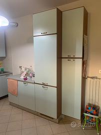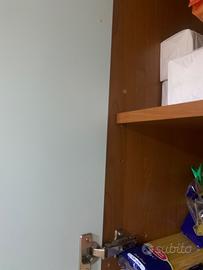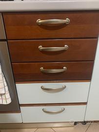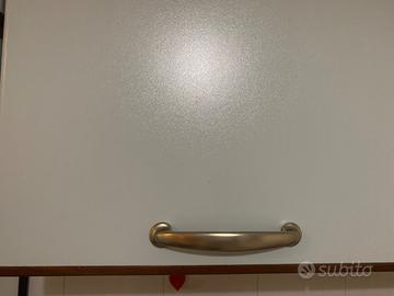 Antine esterne di colore azzurro e maniglie satinate. Di buona manifattura. La cura è l’ottimo materiale di cui è composta, ha fatto sì che si mantenesse come nuova nel tempo. Lavello doppio in inox con anche scolino. Scolapiatti da 90cm molto capiente con vaschetta raccogli goccia. Cassetti capienti. Cappa ben funzionante con luce e diverse velocità. Top rifatto poco tempo fa color grigio. Il plus è la facile pulizia e la qualità dei materiali. Piano cottura a 4 fuochi in inox.
