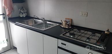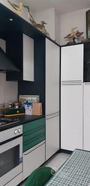 A causa di trasloco in nuova abitazione, propongo un ottimo affare per questa cucina in eccellente stato. È composta da frigorifero e congelatore ( separati ), cucina a metano e forno elettrico, lavandino in acciaio a 2 vasche. Tre cassetti ( verdi ) e un cestone sottostante, piu un altro cassetto sotto il forno e 4 pensili. Cappa perfettamente funzionante. La parte con gli elettrodomestici è lunga metri 3,4 per una profondità di cm 60. La parte composta dai 3 componenti verticali a colonna è lunga metri 1,35 per una profondità di cm 36. Alezza metri 2,20 La struttura delle antine è in alluminio nero ( come è possibile vedere nell'ultimo particolare ), mentre la copertura bianca è in materiale lavabile " mille righe " senza nessun graffio. La propongo a 2000 euro trattabili.