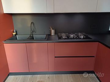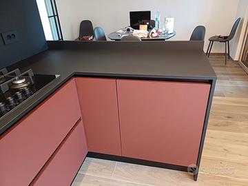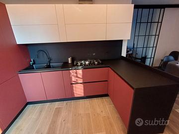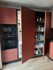 Cedo, per trasferimento in altra casa, cucina usata solo poco più di un anno. Attualmente, si trova in un deposito, non visionabile, già smontata ed imballata. Cedo al prezzo simbolico di € 1.000, corrispondente in pratica ai soli costi di uscita dal deposito dove è attualmente custodita. Il valore in negozio è di € 15.000. Fate un giro e verificate pure il costo del Fenix. Fornisco comunque tutti i dettagli della precedente inserzione. E' facilmente adattabile ad ogni spazio in quanto le ante sono in Fenix, materiale brevettato venduto da ogni produttore di cucine, con i medesimi colori, che sotto vi riporto. Cucina lunghezza mt. 2,590 x 3,170 x 1,530; altezza mt. 2,190 (compreso zoccolo da 15 cm) Marca GM Cucine Mod. XL Materiale Fenix Basi e colonne: Fenix Rosso Jaipur Penisola e schienali: Fenix Nero Ingo Pensili: Fenix Bianco Kos Il Fenix è un materiale brevettato, che troverete presso ogni fornitore di cucine. E' un laminato antimpronta, caratterizzato da una superficie estremamente opaca con bassa riflessione alla luce, morbido al tatto, resistente ai graffi e riparabile, facile da pulire e idoneo al contatto con alimenti. Le ante hanno spessore 22 mm. Non ci sono maniglie. L'apertura è a gola di colore nero e per alcuni elementi con push/pull. Cedo senza elettrodomestici ma solo con la Cappa Falmec integrata e il lavello in fragranite nero con rubinetto in gomma flessibile nero. Posso fornire altre foto.