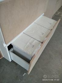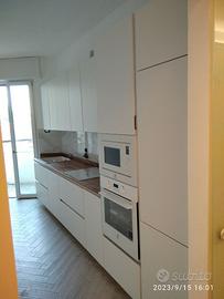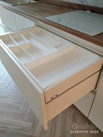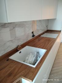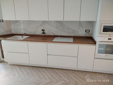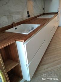 struttura cucina in laminato frontali laccati su listellare mdf bianco opaco, apertura ante cerniere ammortizzate in chiusura e gola in alluminio per apertura cassetti e ante, cassetti scorrono su guide ammortizzate in chiusura sponda alluminio, attaccaglie per i pensili con barra, zoccolo in alluminio h 12cm bianco con piedini livellatori. schienale 1 cm in laminato bianco, ripiani aggiustabili in altezza, compreso cesti per spazzatura 2 porta posate e scolapiatti e fondo in plastica per frigorifero. Varie tamponature. esclusi tutti gli elettrodomestici. Top lunghezza 275 prof. 62 spessore 3 cm circa (costruito a 3 strati) interno multistrato esterno cartelle di OLMO da 6 mm ambo i lati in modo da dare stabilità al tutto e non si muova nel tempo, alzatina posteriore da 6 cm finitura naturale idoneo per acqua. iva non comprendente. non disponibile a magazzino
