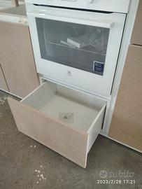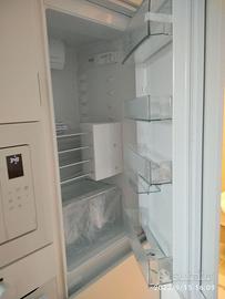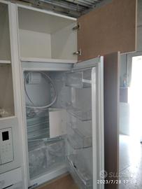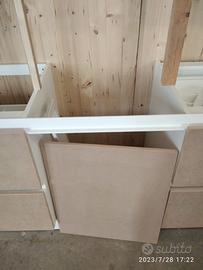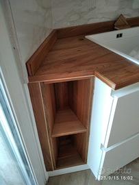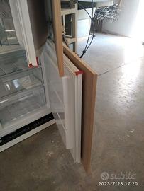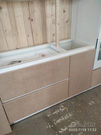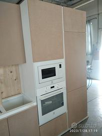 cucina con scocca in laminato bianco, frontali listellare ricoperto di mdf con misura totale 420 cm h 87 + top 3 cm base prof. 62 pensile prof. 38 h 75 pensile. - tamponamento laterale spizzato in olmo. base da 90 predisposto lavello con 2 cassettoni sotto con cesti porta spazzatura e sopra porta spugne. base da 60 predisposto per inserire vs lavastoviglie con frontale e gola x apertura. base 90 con 3 cassetti 1 sopra + 1 nascosto con porta posate e sotto grande capiente. base 45 con anta e ripiano interno. colonna da 60 h 228 disposta sotto 1 cassettone sotto (vano per forno + microonde) e sopra anta. colonna da 60 h 228 disposto per inserire frigorifero freezer con ante e sopra piccolo vano interno recuperabile all’interno della scocca.