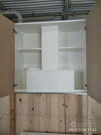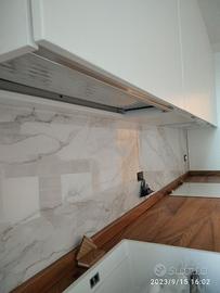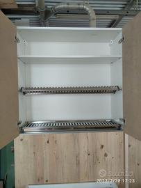 Lato pensili con tamponamento laterale spizzato per compensare la differenza in olmo. pensile da 90 con 2 ante che si aprono su gola e cerniere con scolapiatti incorporato con anta liscia. pensile da 60 apertura se cerniere con ripiano interno e gola per apertura da sotto. 3° pensile da 90 con predisposizione vs cappa a filtri da incasso. pensile da 45 con ripiano e anta.