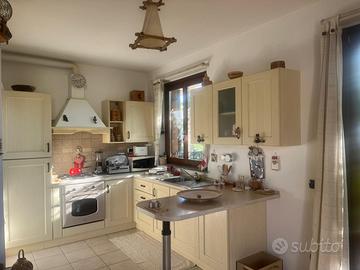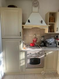 Include piano cottura a 4 fuochi, forno elettrico, cappa aspira fumi, lavastoviglie, frigorifero con congelatore, lavello con rubinetto a miscelatore.
