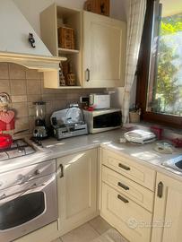 Vendo splendida cucina in legno ad angolo color panna con elettrodomestici e penisola.