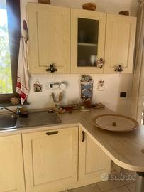 Vendo splendida cucina in legno ad angolo color panna con elettrodomestici e penisola.