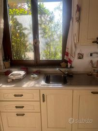 Include piano cottura a 4 fuochi, forno elettrico, cappa aspira fumi, lavastoviglie, frigorifero con congelatore, lavello con rubinetto a miscelatore.